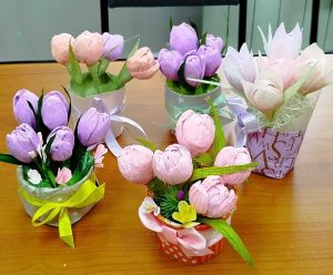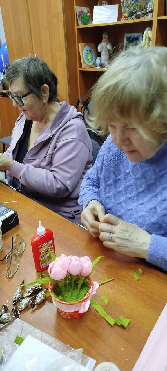 Участницы нашей креативной мастерской осваивают технику создания букетов из конфет. Они готовятся к благотворительной акции, посвященной Международному Женскому Дню 8 Марта, которая пройдет у нас в МБУ «ЦСОН Ленинского района г. Ростова-на-Дону».