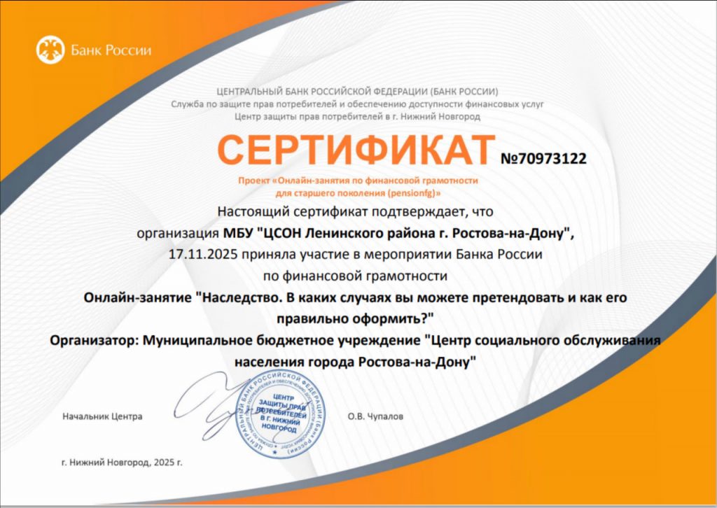 Очередное онлайн- занятие состоялось 17.11.2025г., по итогу которого учреждением был получен именной сертификат.